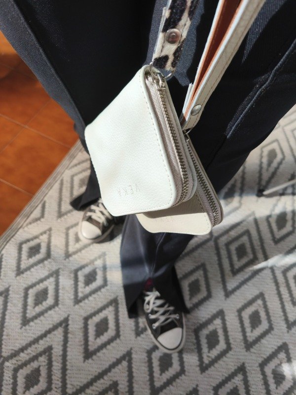 Divisiones para tarjetas y compartimentos para billetes doblados. Muy espaciosa, entran muchos documentos y tarjetas.