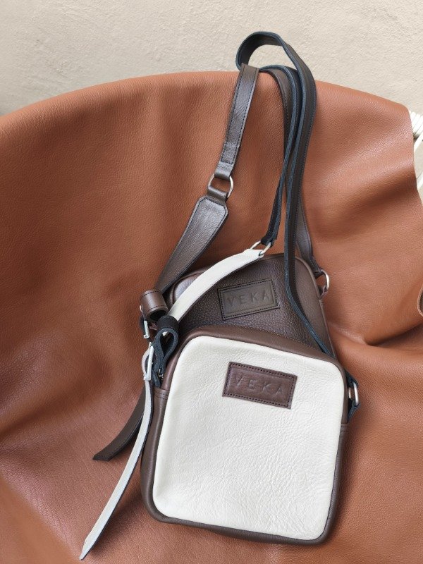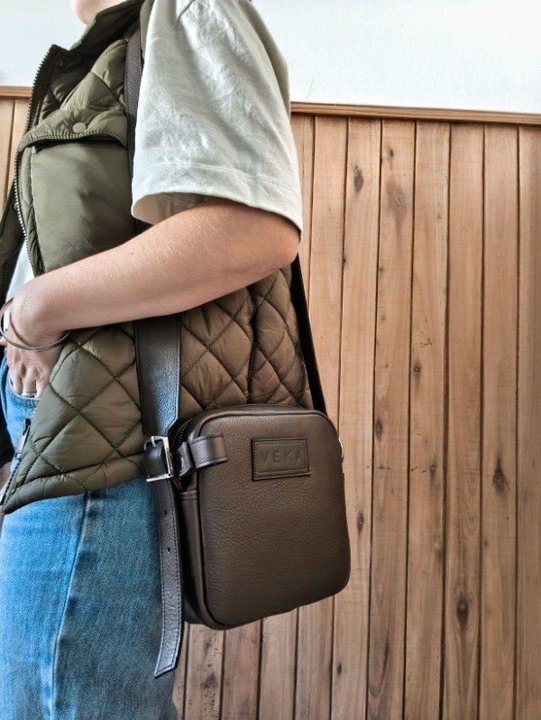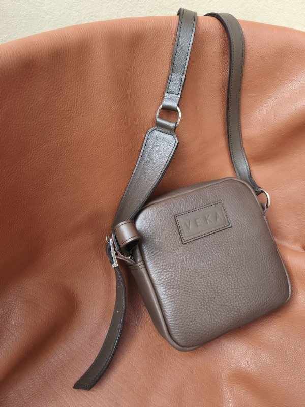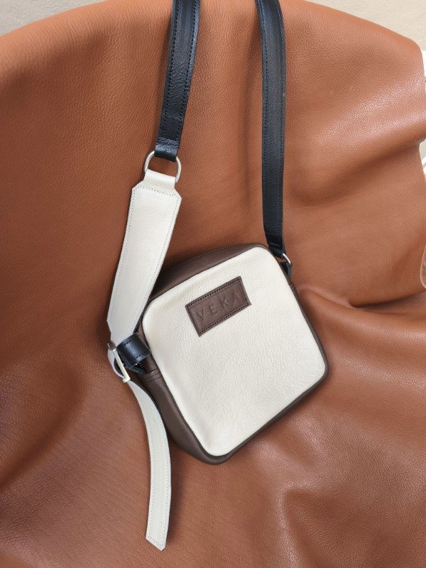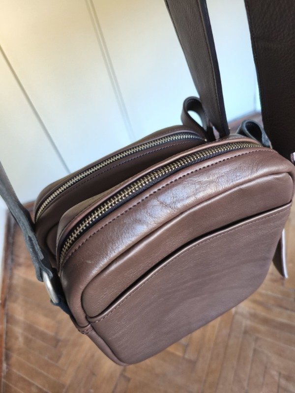 Interior forrado en gabardina de algodón. Bolsillo externo en el lado trasero y uno interno, de cuero. Fuelle con cierre y deslizador metálicos YKK. Correa larga, regulable con hebilla de fundición de 2cm.